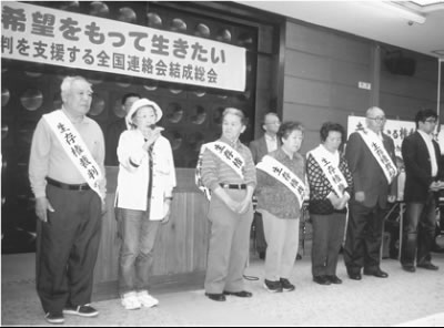集会は、連帯のあいさつや各地の原告の紹介のあと会長に小川政亮さん(全国老人福祉問題研究会名誉会長・日本社会事業大学名誉教授)を拍手で選出して終わりました。